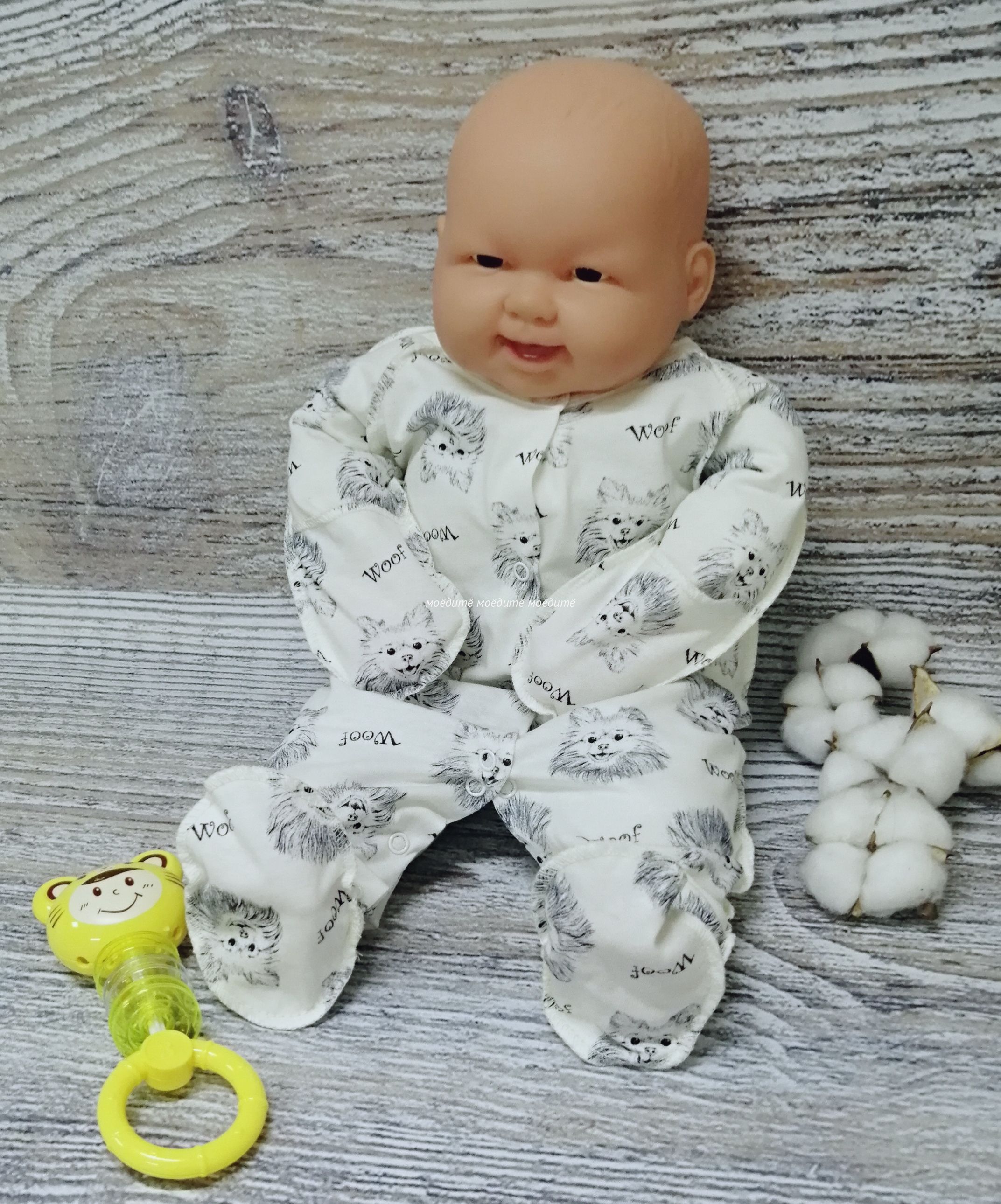 Комбинезон выполнен из 100% хлопка (кулирка), с закрытыми ножками и с рукавчиками-трансформерами, без воротничка, спереди и между ножек на кнопочках.