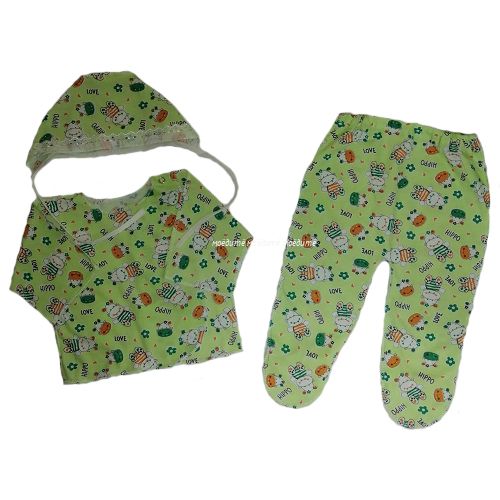 Комплект состоит из распашонки с рукавчиками трансформерами и с кнопочкой на одной стороне, ползунков на резинке, чепчика. Все швы у набора выполнены наружу. Рисунки в каждой партии отличаются.