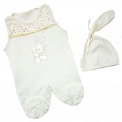 Комплект выполнен из 100% хлопка (интерлок). Комплект на девочку состоит из полукомбинезона с кнопочками на плечиках и между ножек, с закрытыми ножками, спереди украшен вышивкой и шапочки-капельки без завязок.